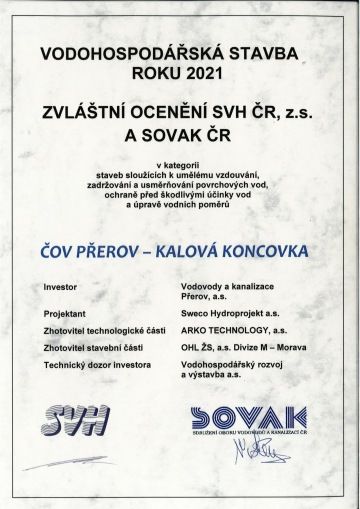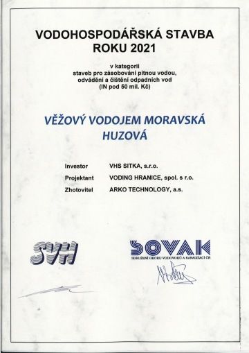 Ocenění za stavbu „Věžový vodojem Moravská Huzová“ (kategorie I, podkategorie do 50 mil. Kč). Zvláštní ocenění SVH ČR a SOVAK ČR v kategorii I – stavby oboru VaK získala stavba „ČOV Přerov – kalová koncovka“.